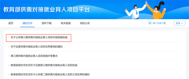 点击《关于公布第三期供需对接就业育人项目申报指南的函》网页底部附件链接,下载“第三期××公司供需对接就业育人项目申请书”。