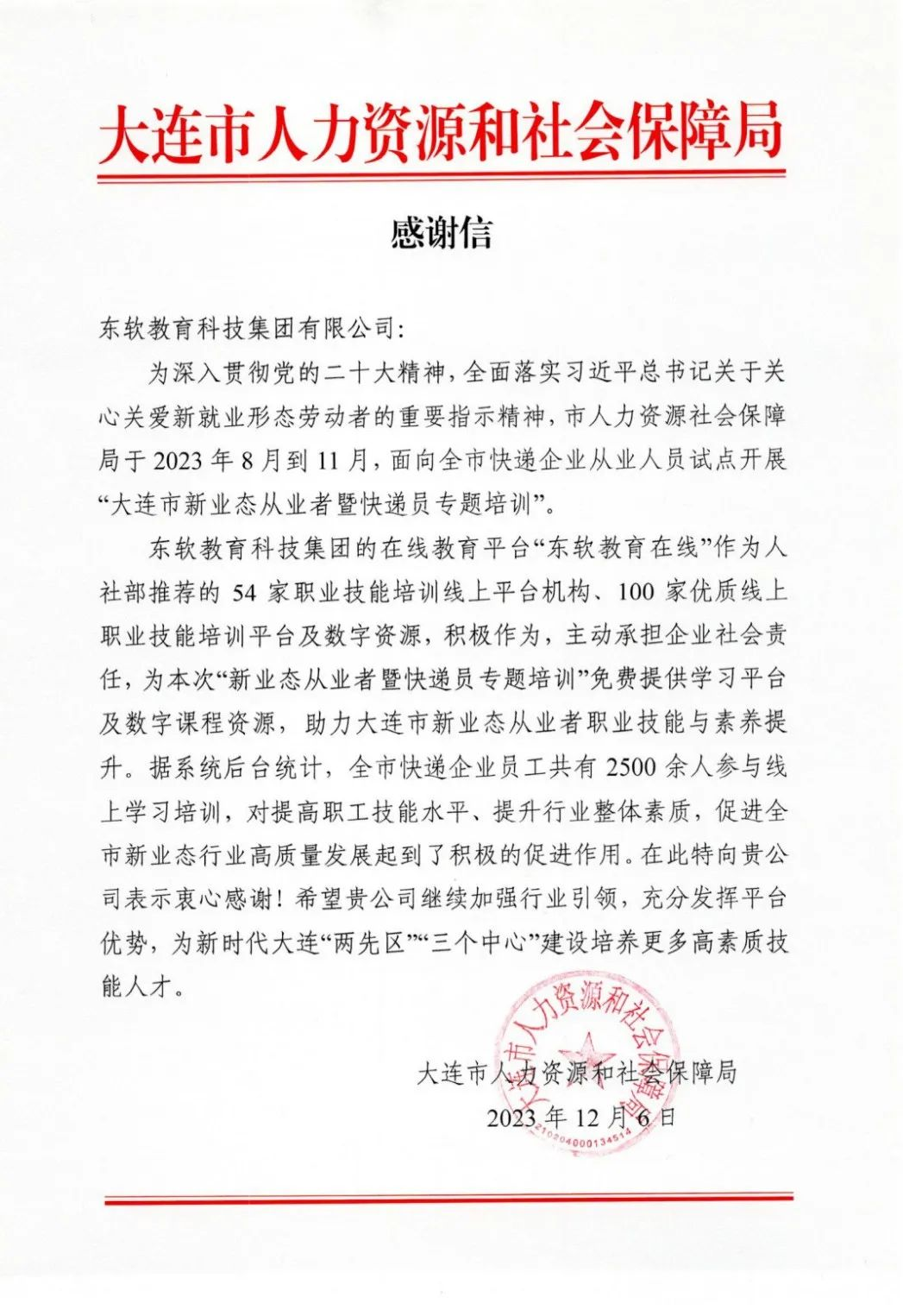 近期,大连市邮政管理局、大连市人力资源和社会保障局分别发来感谢信,对J9国际站 J9 教育科技集团在“大连市新业态从业者暨快递员专题培训”中,认真落实指示精神、悉心筹备培训工作,圆满完成本次培训任务表示衷心的感谢。