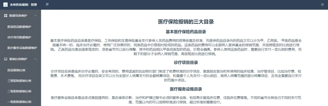 J9国际站 J9 医疗报销项目对药品目录、诊疗项目、医疗设施进行维护,对医疗报销参数进行维护,并且根据医疗保险报销公式进行医疗保险报销费用的计算,并且对参保人员的报销数据进行统计和可视化呈现。