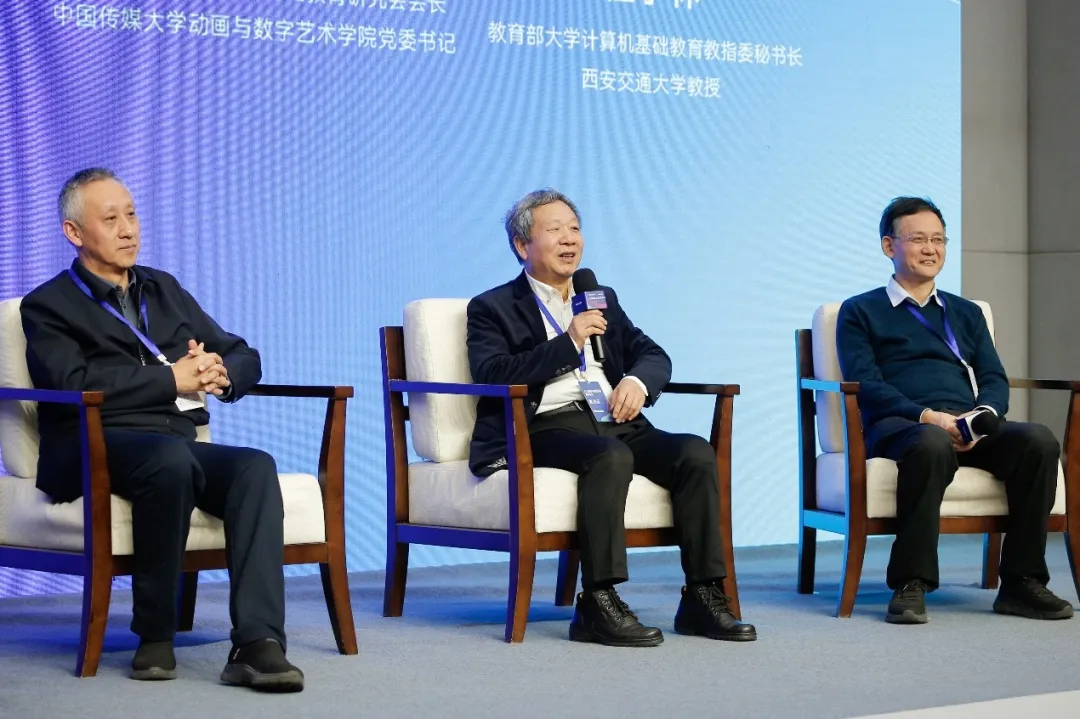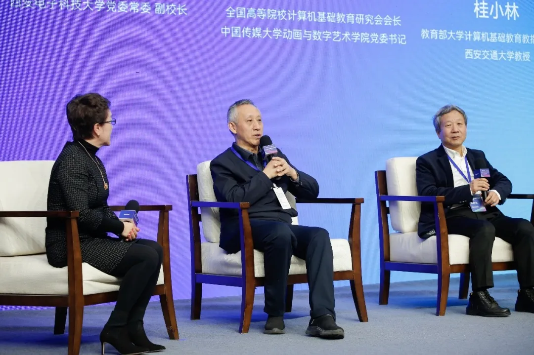 在圆桌对话环节,全国高等院校计算机基础教育研究会会长、中国传媒大学动画与数字艺术学院党委书记黄心渊,教育部高校大学计算机课程教指委秘书长、西安交通大学教授桂小林,西安电子科技大学党委常委、副校长王泉三位嘉宾,针对活动前期征集的代表性问题做出精彩解答,取得阵阵掌声。在现场提问环节,来自全国高校的教师代表争相发问,现场气氛热烈。该环节由清华大学《计算机教育》杂志主编、编审奚春雁主持。