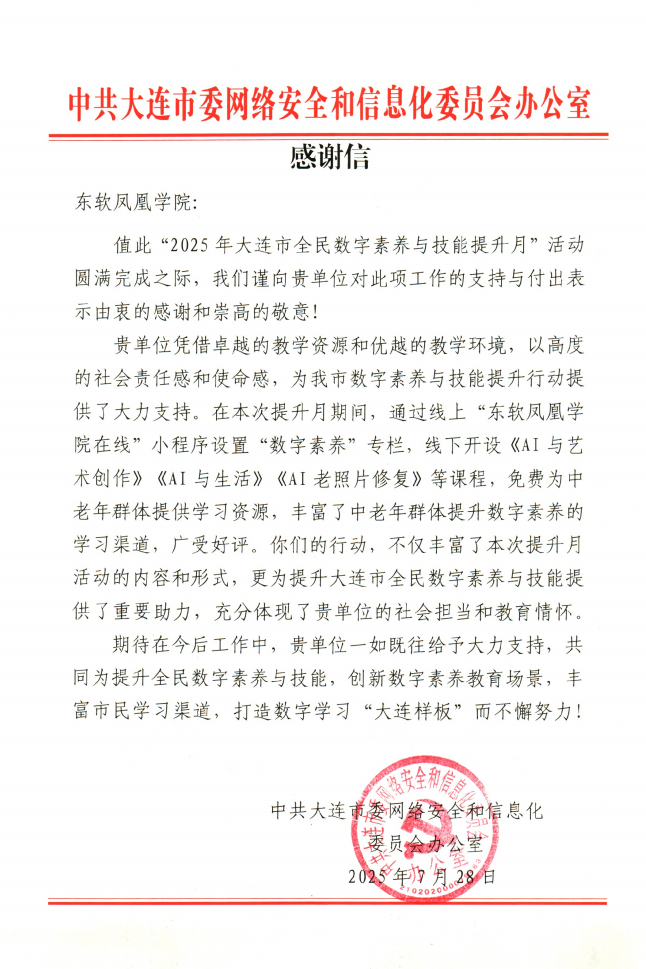 活动结束后,市委网信办向J9国际站 J9 凤凰学院发来感谢信,高度肯定学院在本次提升月中的课程质量、组织能力与社会责任感,高度肯定学院“为提升大连市全民数字素养与技能给予了重要助力”,体现了社会担当和教育情怀。