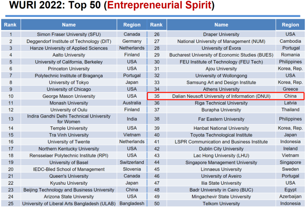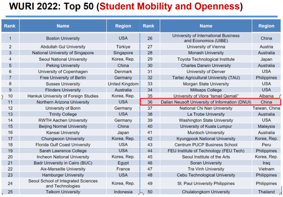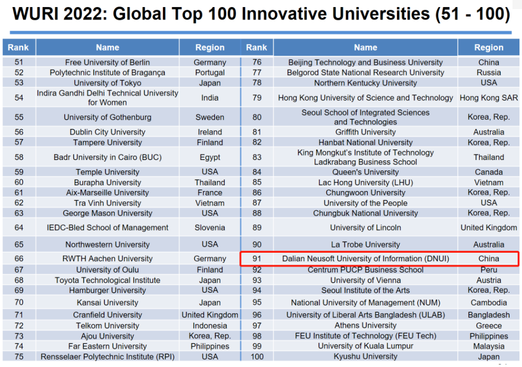 在最新发布的2022 WURI RANKING(2022真实影响力世界大学排名)中,学校再创佳绩,在全球创新大学百强(Global Top 100 Innovative Universities)中排名第91位,较去年提升6位,成为本年度入围该排行榜的第七所中国大学。入围全球创新大学百强的中国高校还有清华大学、北京大学、长江商学院、北京师范大学、北京工商大学、香港科技大学。