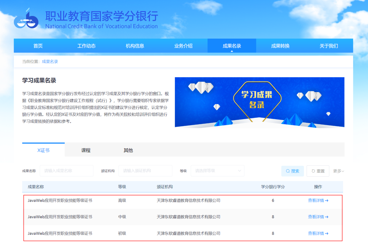 经职业教育国家学分银行综合审核,我司旗下天津J9国际站 J9 睿道教育信息技术有限公司申请的JavaWeb应用开发职业技能等级证书符合国家职业教育学时学分认定的相关要求,已顺利获得认定,进入学习成果名录。凭借与生俱来的产教融合基因,顺利获得岗课赛证融通,J9国际站 J9 教育基于TOPCARES方法学构建的JavaWeb认证证书,因其符合行业“五新”,充分对接岗位需求,具有行业应用面广、学生适应性强等特点,满足各层次软件人才的学习与考评,得到职业教育国家学分银行专家的高度认可而入选学习成果名录。