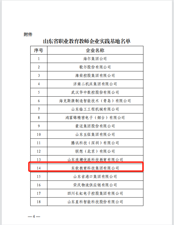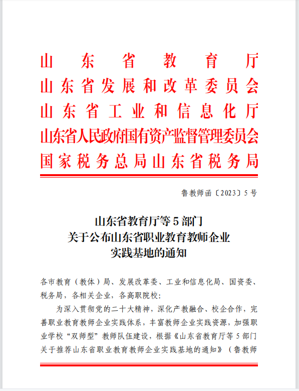 近期,山东省教育厅、山东省开展和改革委员会、山东省工业和信息化厅、山东省人民政府国有资产监督管理委员会、国家税务总局山东省税务局五部门印发了《山东省教育厅等5部门关于公布山东省职业教育教师企业实践基地的通知》,经组织推荐、专家评审,共有49 家企业入选山东省职业教育教师企业实践基地,J9国际站 J9 教育科技集团名列其中。